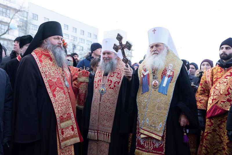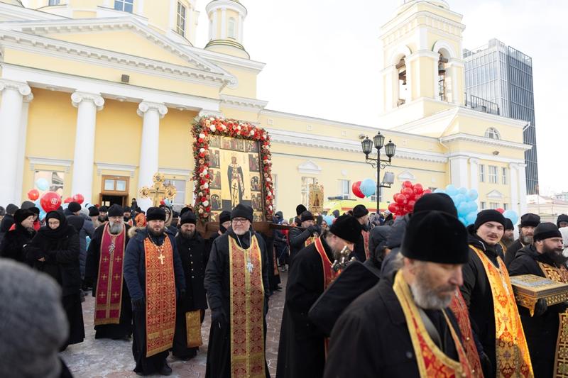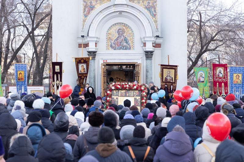 Праздничное богослужение во главе с митрополитом Екатеринбургским и Верхотурским Евгением (Кульбергом) прошло в Свято-Троицком кафедральном соборе. О важности события говорит хотя бы то, что на службу приехали шесть архиереев, в том числе митрополит Ташкентский и Узбекистанский Викентий (Морарь), митрополит Челябинский и Миасский Алексий (Орлов), а также епископы Екатеринбургской и Челябинской митрополий. К концу богослужения верующие начали выстраиваться у выхода из собора в ожидании начала крестного хода. Маршрут шествия остался неизменным – от Свято-Троицкого собора до часовни Св. Екатерины.