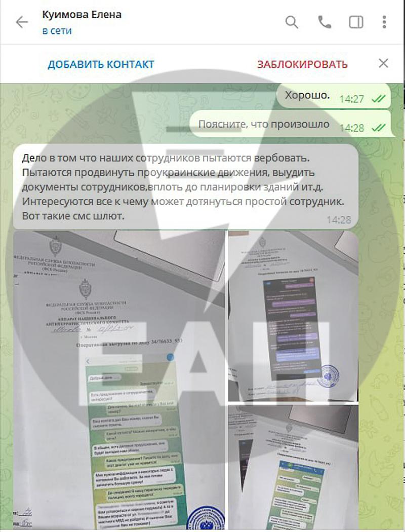 «Дело в том, что наших сотрудников пытаются вербовать. Пытаются продвинуть проукраинские движения, выудить документы сотрудников, вплоть до планировки зданий и т. д. Интересуются всем, к чему может дотянуться простой сотрудник. Вот такие СМС шлют».