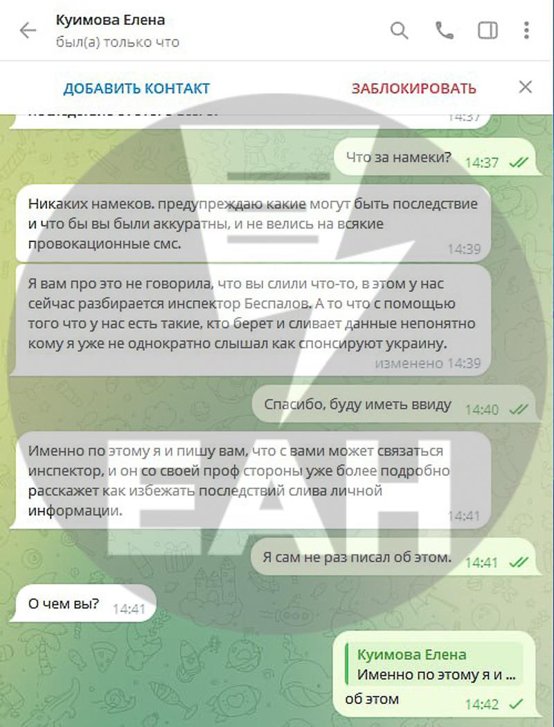 Корреспонденту ЕАН, несколько лет назад работавшему в Ura.ru, в telegram обратился некто, представившись Куимовой Еленой Викторовной, директором «Сибирско-Уральской медиакомпании». Из сути вопросов стало понятно, что это провокация, причем явно имеющая украинский след.
