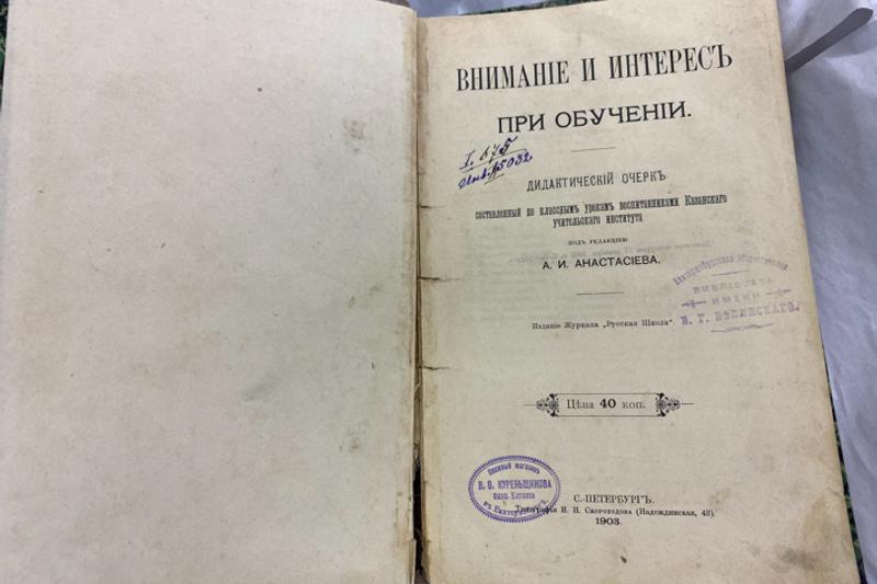 А историю рассказал такую. В книгу "Внимание и интерес при обучении" был вложен лист с записью о том, что данная книга взята в июле 1919 года, а должна быть возвращена через месяц. К сожалению, лист не сохранился. Но сохранилась старая печать Белинки. Почему читатель не вернул книгу через месяц - остается только догадываться», - говорится в сообщении.