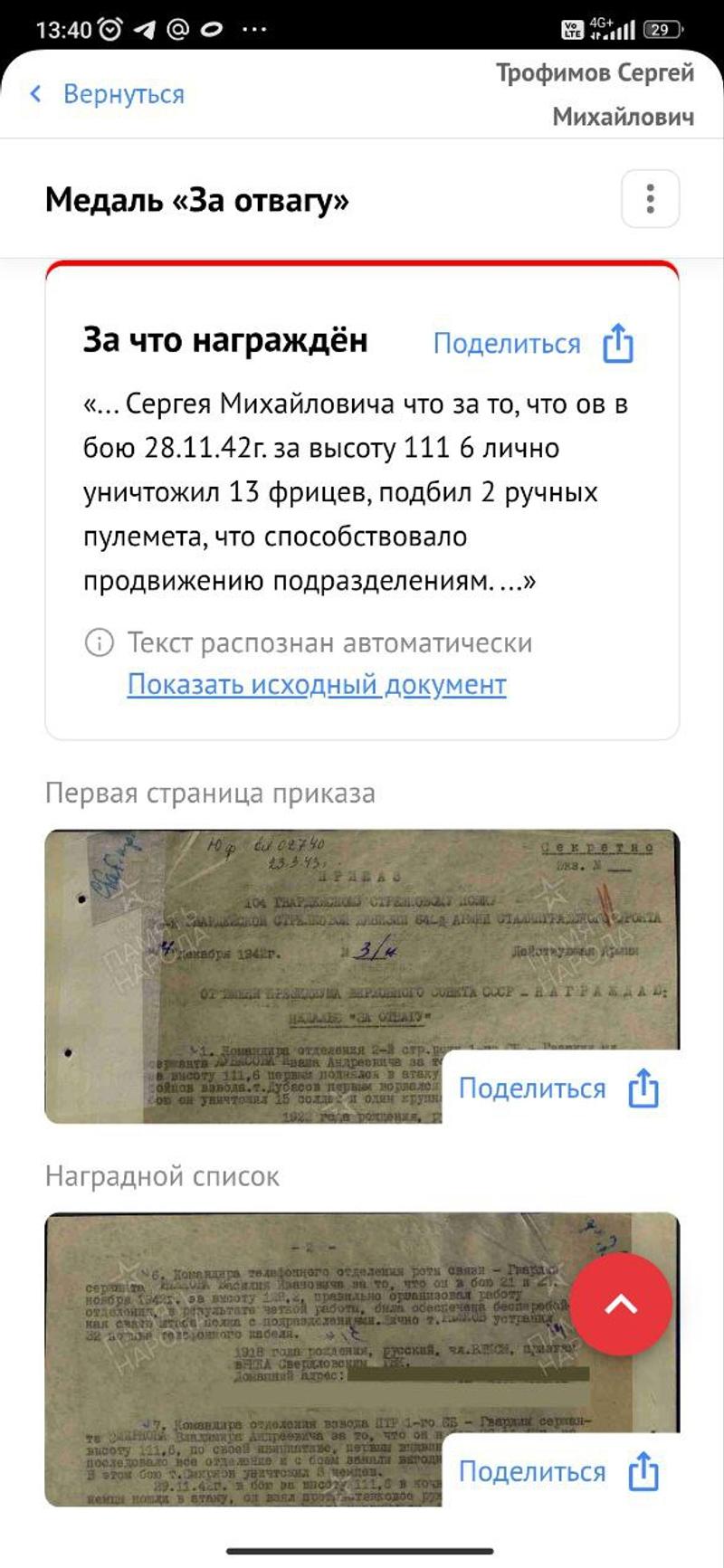 Читатель ЕАН Марина Дегтярева поделилась своей историей – ей удалось найти новую информацию о ее дедушке Сергее Михайловиче Трофимове. «В нашей семье бережно хранятся документы и награды дедушки, который воевал под Сталинградом. Не думала, что узнаю, какие-то новые сведения, заходя на сайт «Память народа». Было интересно увидеть подлинные документы о награждении и о том, какой подвиг совершил мой дедушка», - рассказала Марина.