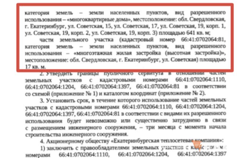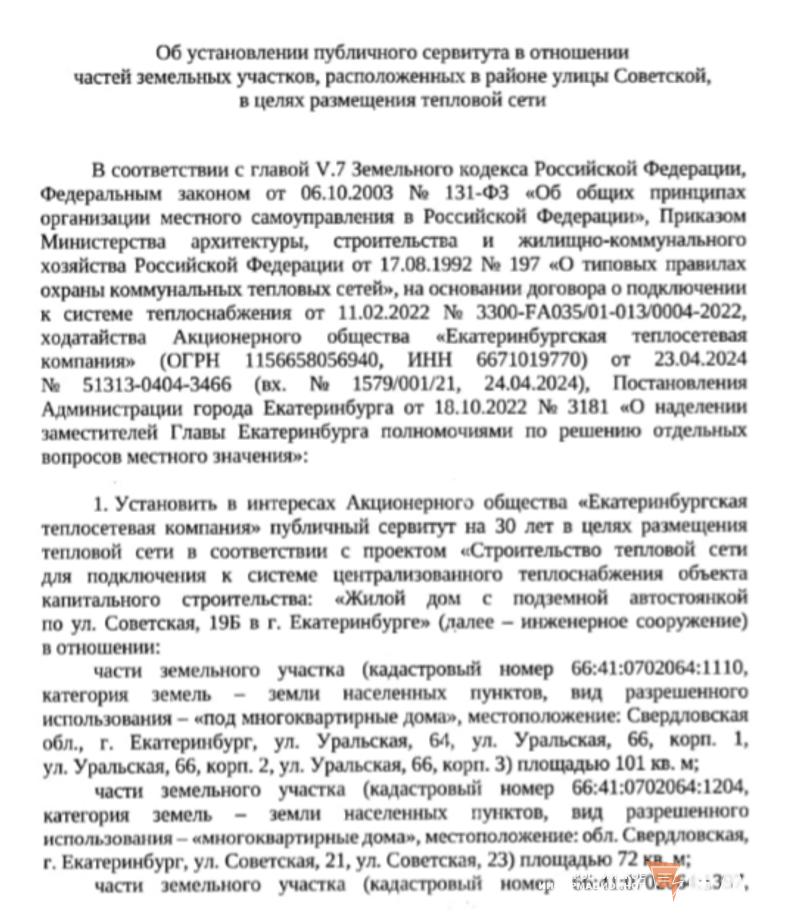 Как выяснилось, еще 29 мая 2024 года глава Екатеринбурга Алексей Орлов утвердил публичный сервитут в интересах АО «ЕТК» сроком на 30 лет для проведения коммуникаций к многоквартирному дому с подземной парковкой по улице Советской, 19 «б». Общая площадь участка 641 кв. м.