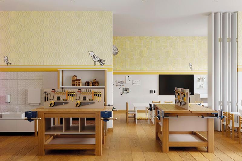 Планируется, что дошкольники будут учиться быть самостоятельными и осваивать ремесло, посещая детский сад. Для этого предусмотрены столярная мастерская для мальчиков и швейная мастерская для рукоделия девочек. По словам Кондратьевой, в них будут оборудованы станки и швейные машинки, разработанные специально для детей. В столовой, помимо приема пищи, дошколята будут участвовать в кулинарных мастер-классах.
