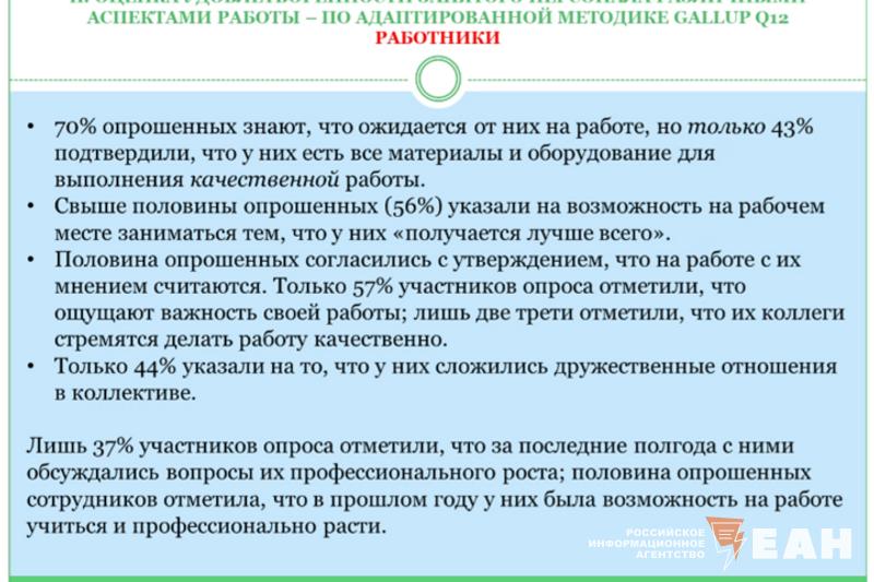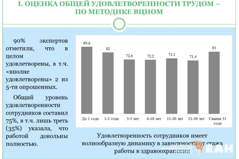 В докладе указывалось, что свыше 75% опрошенных удовлетворены своим трудом, его характером и содержанием. Большая часть опрошенных заявляют о том, что их организация заставляет их чувствовать, что их работа является крайне важной; они стремятся выполнять свою работу как можно более качественно, что у них имеются все возможности на рабочем месте, чтобы выполнять свою работу с наилучшим качеством, способствуя достижению цели медицинской организации.