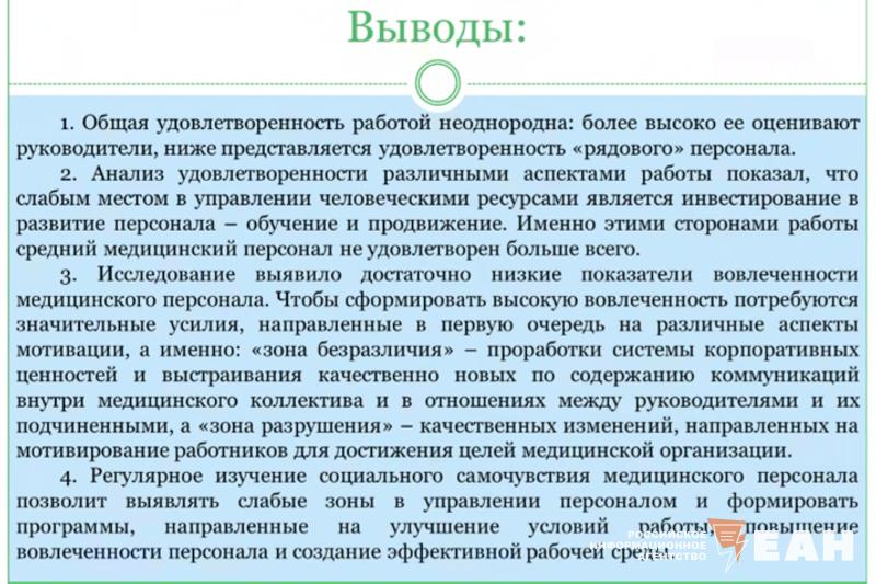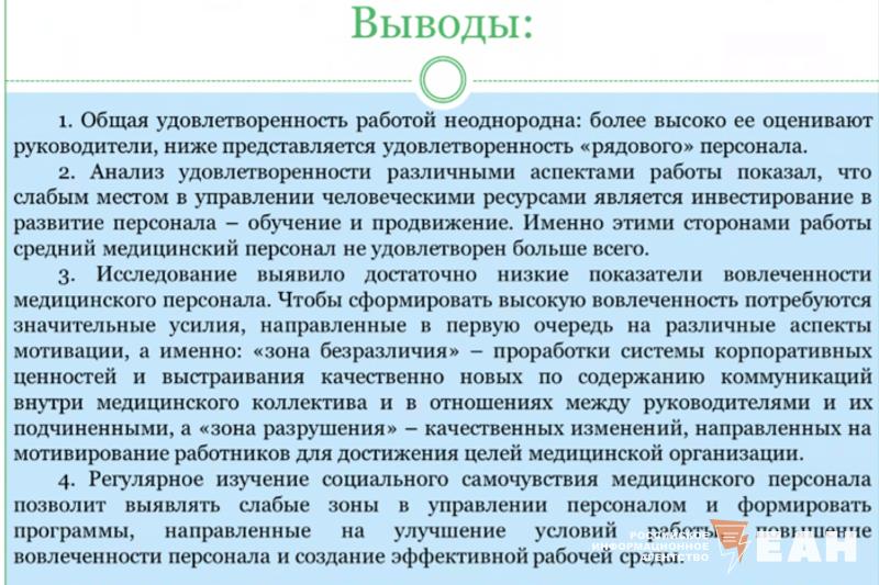 Представленные данные были призваны обнаружить «болевые точки», показать, что медицинским организациям необходимо изучать мнения своих работников как для того, чтобы предупреждать возможные негативы, так и для того, чтобы разрабатывать программы удержания кадров за счет внедрения наставничества, ротации кадров, расширения возможностей повышения профессионального мастерства и пр.»