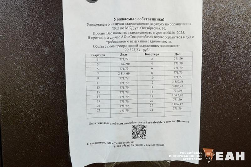 На доме висит объявление о том, что жильцы дома задолжали плату за вызов мусора. Дом-призрак разграблен и разваливается, люди в нем не живут, но они все равно должны.
