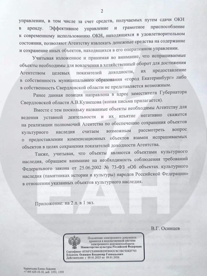 Заместитель министра культуры РФ Владимир Осинцев в своем ответе в адрес главы Свердловской области (документ имеется в распоряжении ЕАН) прямо написал, что объекты недвижимости, расположенные в Екатеринбурге по улице Карла Либкнехта, 44, необходимы для достижения показателей доходности управляющему объектами Агентству по управлению и использованию памятников истории и культуры (АУИПИК). Как пишет Владимир Осинцев, деньги, которые АУИПИК получает за сдачу в аренду ОКН, позволяют содержать и сохранять иные объекты, находящиеся в его оперативном управлении. В связи с этим, сообщает Денису Паслеру замминистра культуры, предоставление объектов по Карла Либкнехта, 44 в собственность Екатеринбурга либо в собственность Свердловской области не представляется возможным.