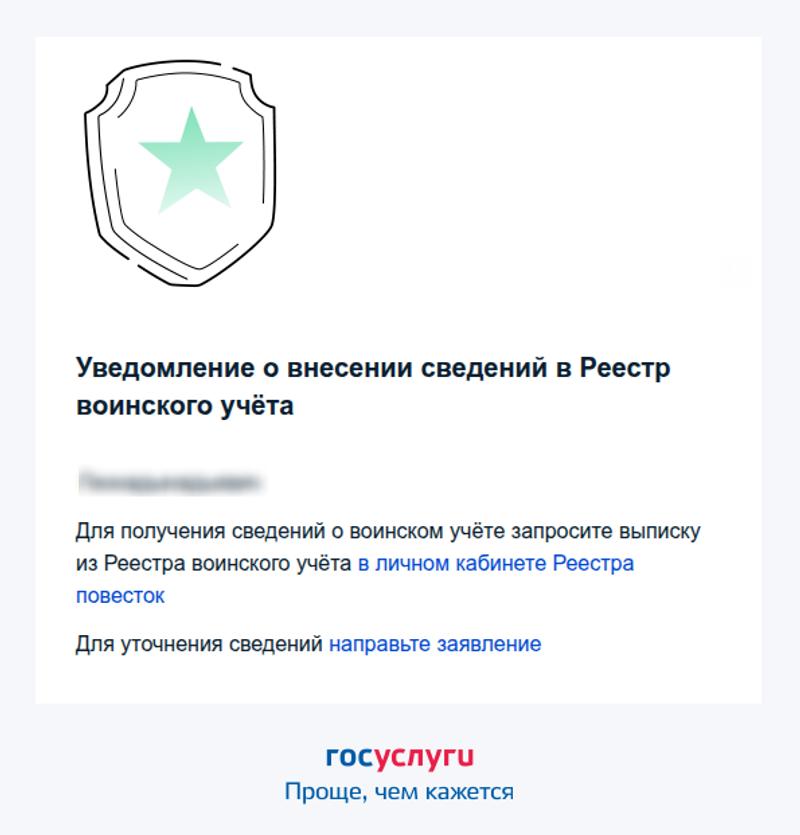 Однако само уведомление о внесении в реестр воинского учета не приравнивается к повестке. Пользователя «Госуслуг» просто ставят в известность, что у военкомата уже есть все необходимые данные на него. Никаких юридических последствий уведомление не несет. Нюанс однако в том, что в реестр вносят данные всех военнообязанных граждан независимо от наличия аккаунта на портале »Госуслуги». Точно так же вручаются повестки: даже если аккаунта на портал нет, появление повестки в реестре будет считаться ее вручением.