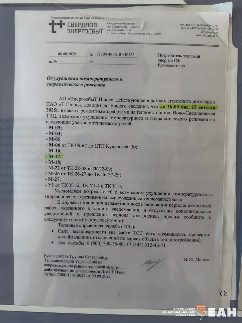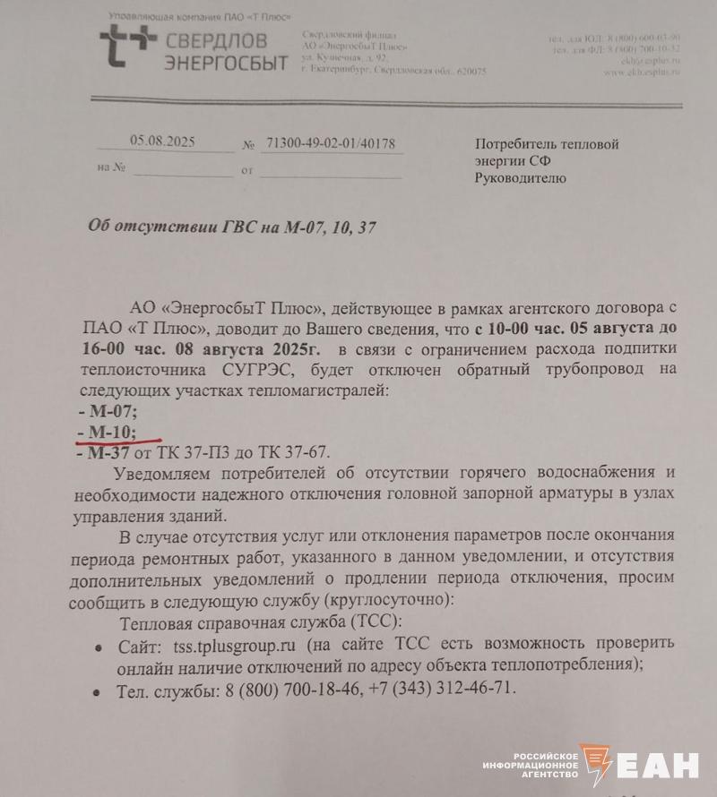 «АО «ЭнергосбыТ Плюс», действующее в рамках агентского договора с ПАО «Т Плюс», доводит до вашего сведения, что до 16:00 15 августа в связи с ремонтными работами на теплоисточнике Ново-Свердловская ТЭЦ возможно ухудшение температурного и гидравлического режимов на следующих участках тепломагистралей…»