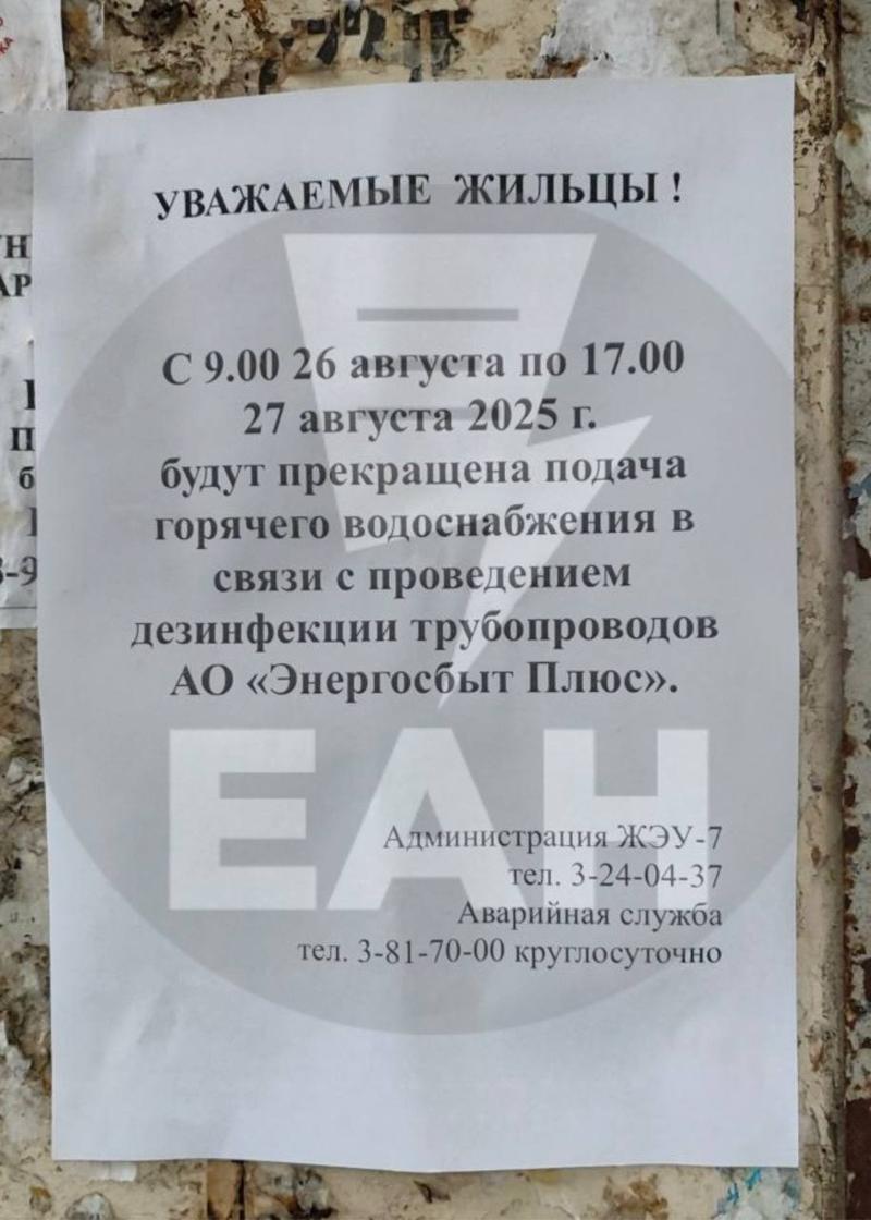 В объявлении, которое повесили на дверях подъездов, сообщается, что обработка прошла с 09:00 26 августа до 17:00 27 августа. При этом, по словам жителей района, горячей воды все еще нет.