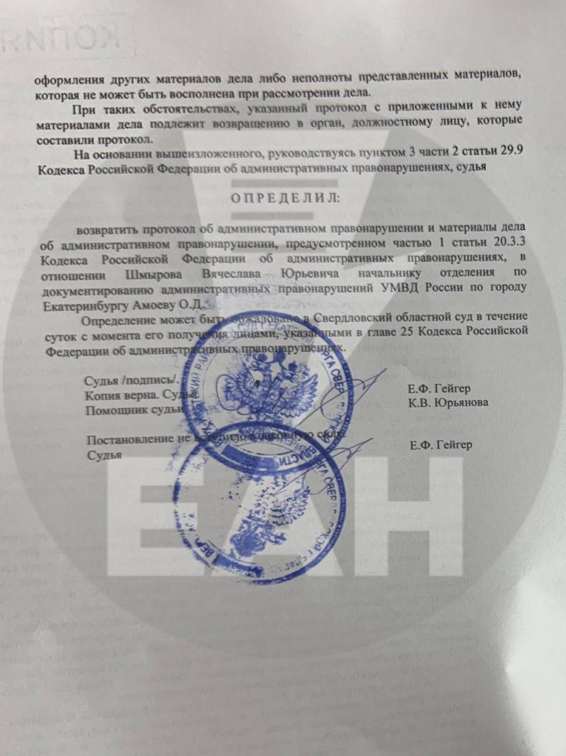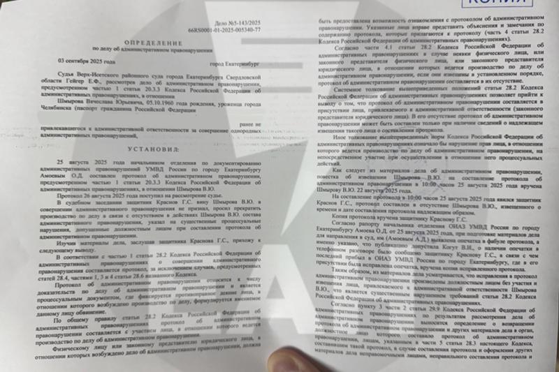 Судья Верх-Исетского районного суда Екатеринбурга вернула в полицию дело о дискредитации Вооруженных сил РФ, которое было составлено в отношении куратора киноклуба Ельцин Центра Вячеслава Шмырова. Как сообщает корреспондент ЕАН из зала суда, причиной стали ошибки в материалах.