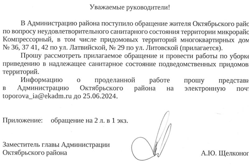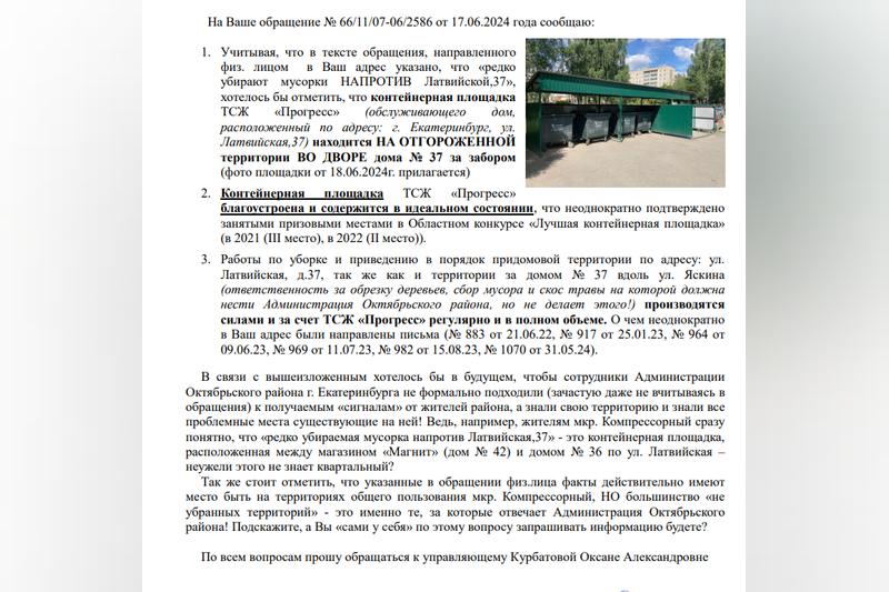 Доходит до того, что представители администрации даже сами не разбираются, где и что у них происходит. В июне 2024 года мы столкнулись с такой ситуацией: от жителя нашего микрорайона в администрацию поступила жалоба на неудовлетворительное состояние контейнерной площадки, расположенной напротив домов №36, 37 и 42 на Латвийской. Все местные жители понимают, где эта «постоянно не прибранная мусорка» находится, а сотрудники нашей администрации не понимают. В итоге в три ТСЖ ими были направлены требования отчитаться за состояние контейнерной площадки.