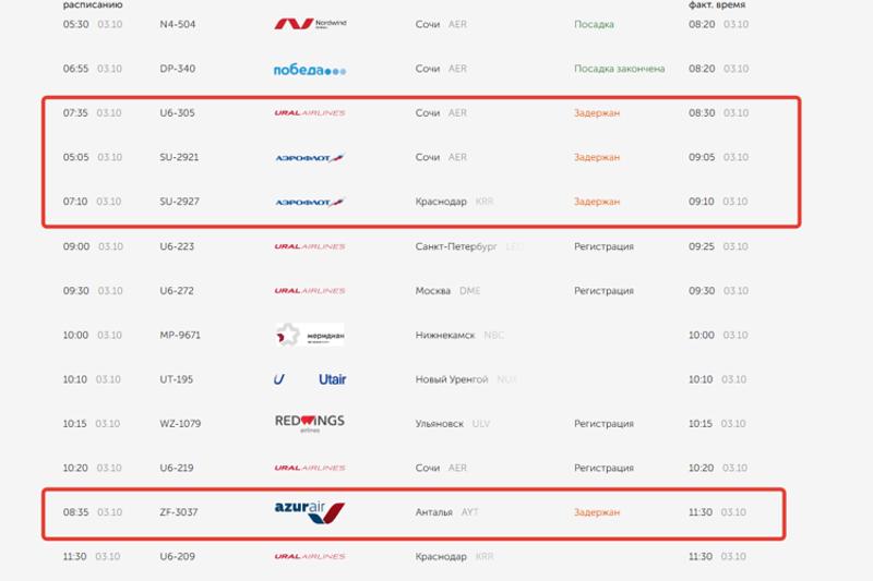С задержкой будут выполнены рейсы «Аэрофлота», «Уральских авиалиний», «России» и «Победы». Некоторые вылеты отстают от расписания на час, а у нескольких лайнеров задержка составляет 7-8 часов. Также с опозданием в три часа ожидается отправка рейса Azur Air в Анталью.