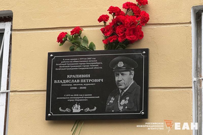 Памятную доску установили на Мира, 44, где на общественных началах работал Крапивин и почти 40 лет располагался центр «Каравелла». Торжественную церемонию в Екатеринбурге открыли барабанщики «Каравеллы» и руководитель отряда Лариса Крапивина. Она подчеркнула важную роль писателя в формировании жизни многих свердловских детей. Также на открытии присутствовала жена писателя Ирина Крапивина.