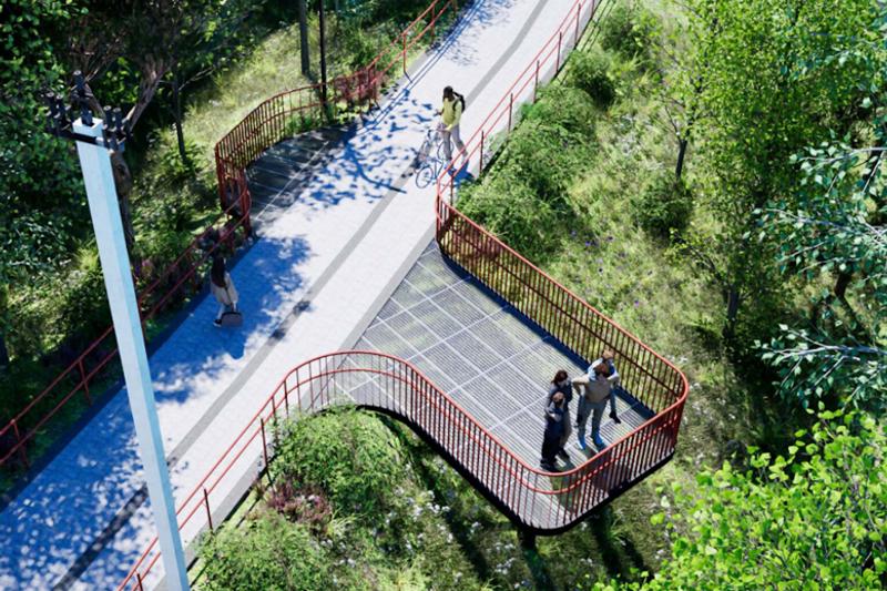 На этом участке планируется проложить сеть тропинок с беседками, скамейками, качелями, террасами на рельефе, смотровыми площадками, ландшафтным объектом – зеленой долиной. Предусмотрены кафе и павильон для аренды велосипедов, мост через детскую железную дорогу и гать. Вся аллея будет освещена, а малые архитектурные формы также получат подсветку.