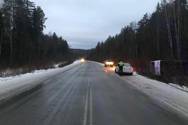 Пассажирский автобус вылетел на обочину и опрокинулся на трассе возле Первоуральска. Об этом сообщает пресс-служба ГАИ Свердловской области.