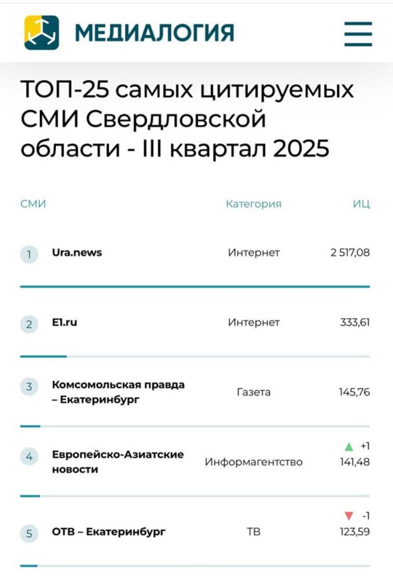 РИА «Европейско-Азиатские Новости» вновь попало в рейтинг самых цитируемых СМИ Свердловской области по итогам III квартала. Издание заняло четвертое место в списке «Медиалогии».