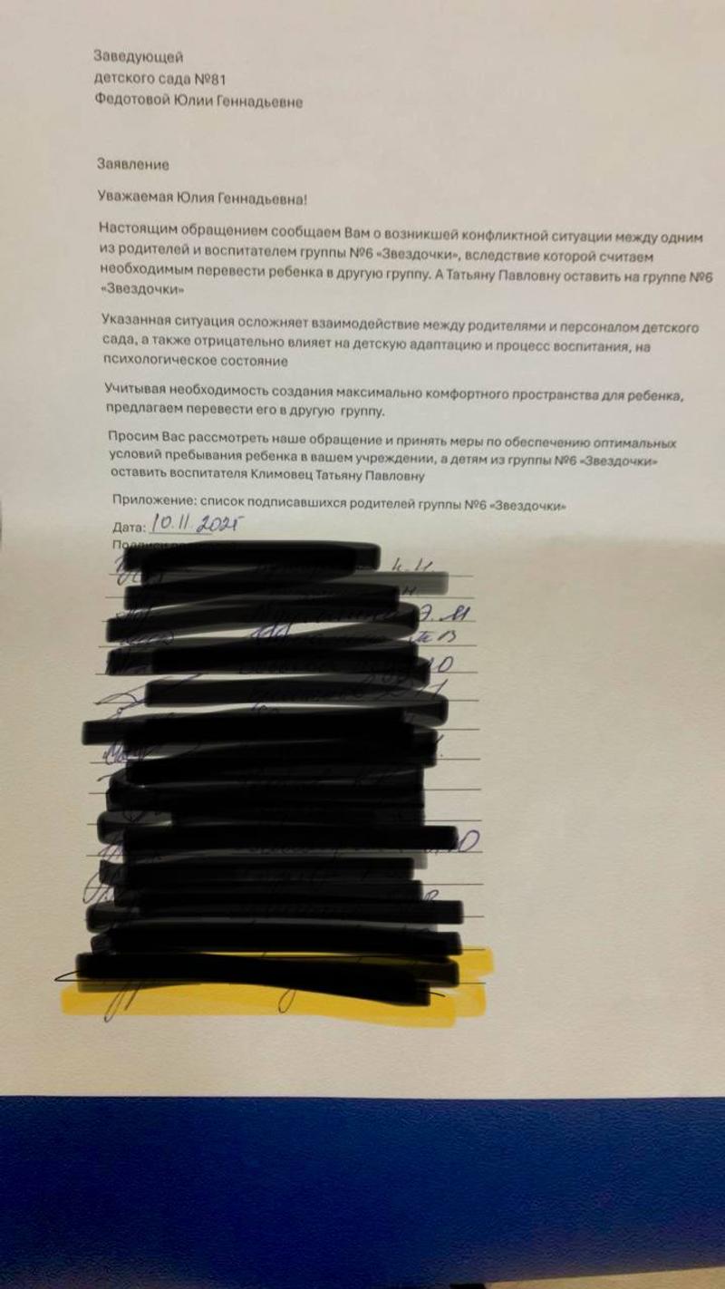 Также они приложили скрин обращения к заведующей детским садом Юлии Федотовой, в котором просят сохранить Татьяну Климовец в качестве воспитателя в группе их детей. Родители пишут, что воспитатель создает теплую атмосферу и ее уход за полгода до выпускного негативно скажется на психологическом и моральном состоянии детей. Они считают, что в другую группу следует перевести самого мальчика.