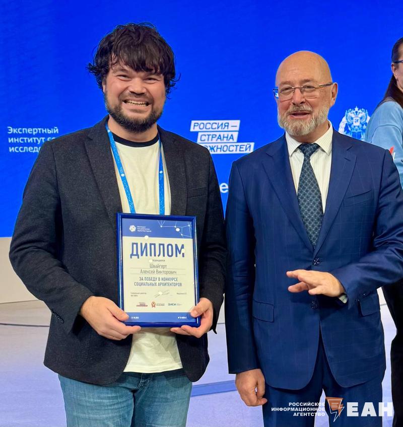 Александр Пирогов и Алексей Швайгерт – победители первого конкурса социальных архитекторов, инициированного администрацией президента России. Двести двадцать финалистов, прошедших отбор из 7500 заявок на платформе «Россия – страна возможностей», в ноябре прибыли в мастерскую управления «Сенеж». В финале конкурса участники должны были подтвердить свои компетенции, чтобы иметь право называться социальными архитекторами. Победителями стали 74 человека.