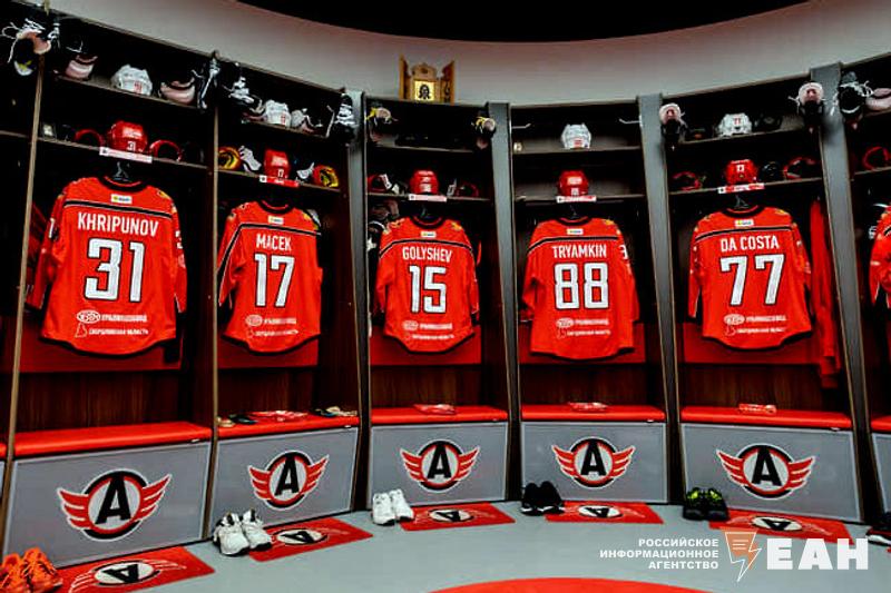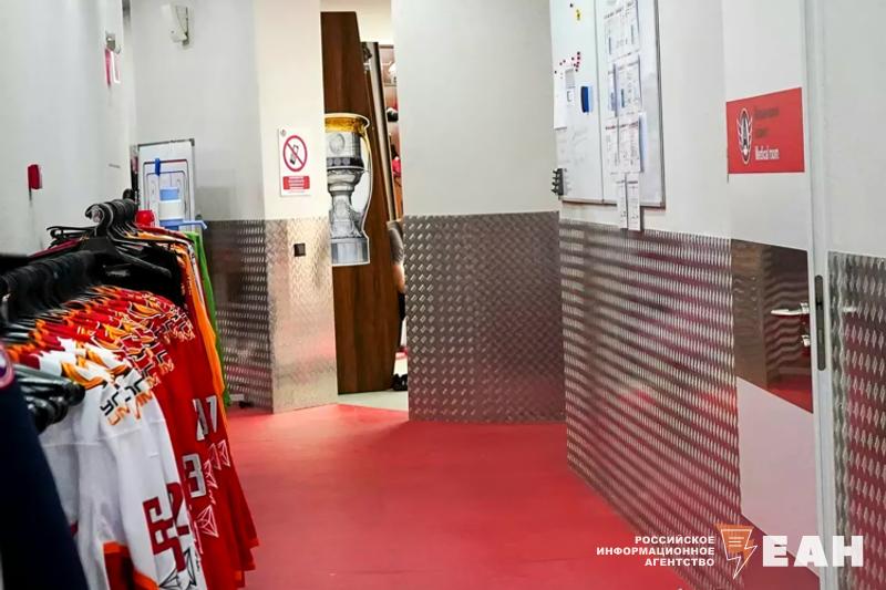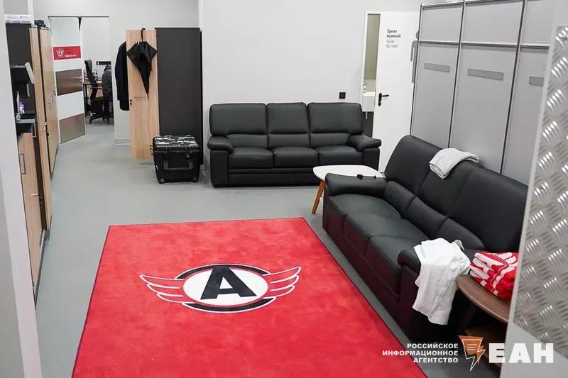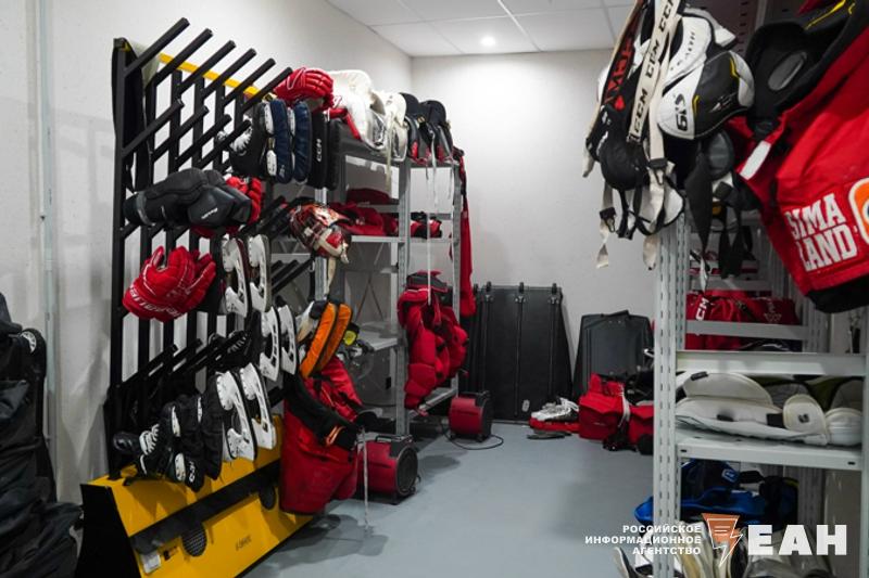 Пройдя по коридору, игроки попадают в просторную раздевалку. В удобных шкафчиках спортсмены разместили свои вещи, а Кирилл Воробьев даже украсил его рисунками своих детей. Места для вратарей выделяются — они шире обычных, чтобы вместить объемную амуницию. В помещении есть телевизор, тактическая доска, в середине большой стол с необходимыми напитками и продуктами. Над столом висит большая панель с логотипом команды.