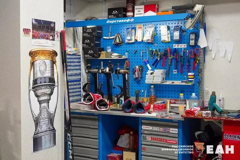 Напротив раздевалки расположена мастерская сервисменов — идеальное место для оперативной помощи. У каждого специалиста здесь свой уголок для работы. Николай Поспелов отвечает за заточку коньков. Он доводит лезвия до идеальной остроты, подстраивая их под стиль катания каждого игрока. Анастас Шумов занимается формой и амуницией: чинит экипировку, работает на швейной машинке и следит за каждой деталью. Вместе сервисмены слаженно следят, чтобы игроки могли сосредоточиться только на игре. Перед матчем они развешивают джерси так, «чтобы видеокамеры снимали красиво», аккуратно раскладывают экипировку. Если игрок получил новые коньки — формуют ботинок, чтобы он идеально повторял анатомию стопы.