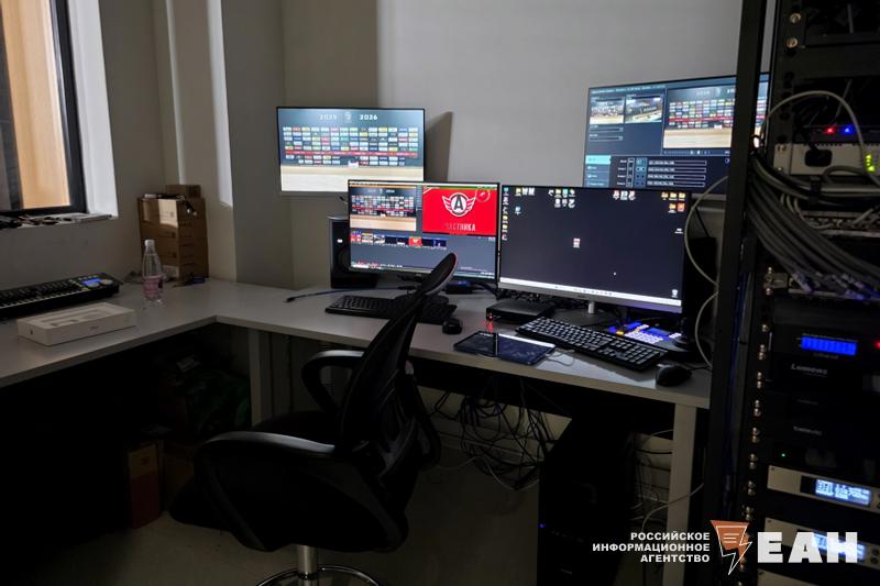Девять камер с операторами, шесть стационарных камер, оборудование в раздевалках и за воротами — все это объединено в единую систему. Сигнал с «УГМК-Арены» уходит напрямую в Останкино.