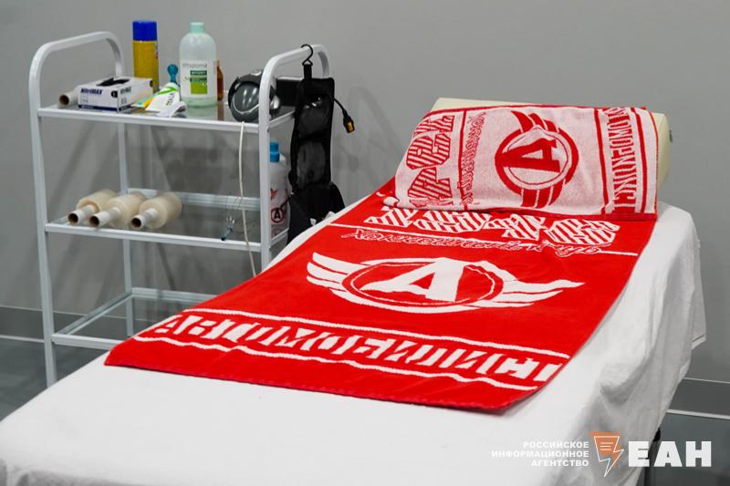 Ильшат Гайнуллин, Александр Белов и Павел Воложенинов начинают рабочий день раньше всех: готовят воду, зал и полотенца. Затем — поток растираний, разогрева и ручной работы с мышцами игроков. Просторный массажный кабинет позволяет обеспечить комфорт для каждой процедуры.