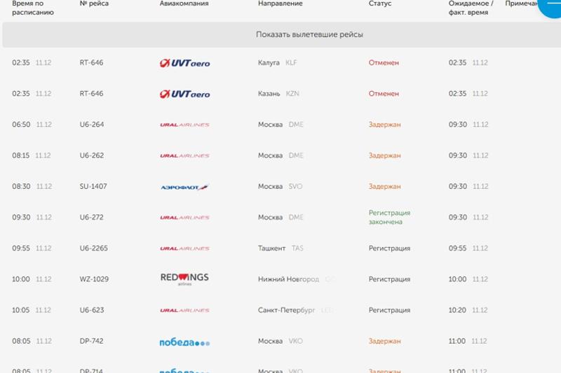 Не смогли вовремя вылететь в столицу самолеты «Уральских авиалиний», «Аэрофлота», «Победы» и «Смартавиа». Задержки составляют от часа до четырех часов. Отменены рейсы «Аэрофлота» на 13:55 и 15:20.