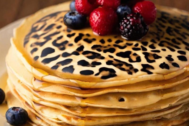 Технология создания «леопарда» требует сноровки. Сначала на сковороду выкладывают узор из темного теста, затем заливают светлым. В результате получается эффектный контраст. Такая визуальная составляющая блюда в этом году стала важна не менее вкуса.