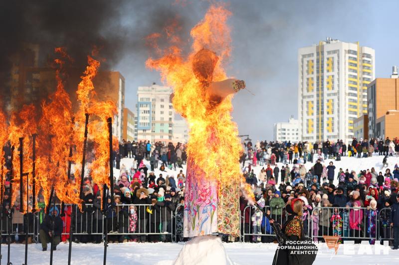 На ярмарке все желающие могли угоститься блинами и выпить горячего чаю. А кульминацией гуляний стало традиционное сжигание чучела Масленицы, символизирующее прощание с зимой и встречу весны.