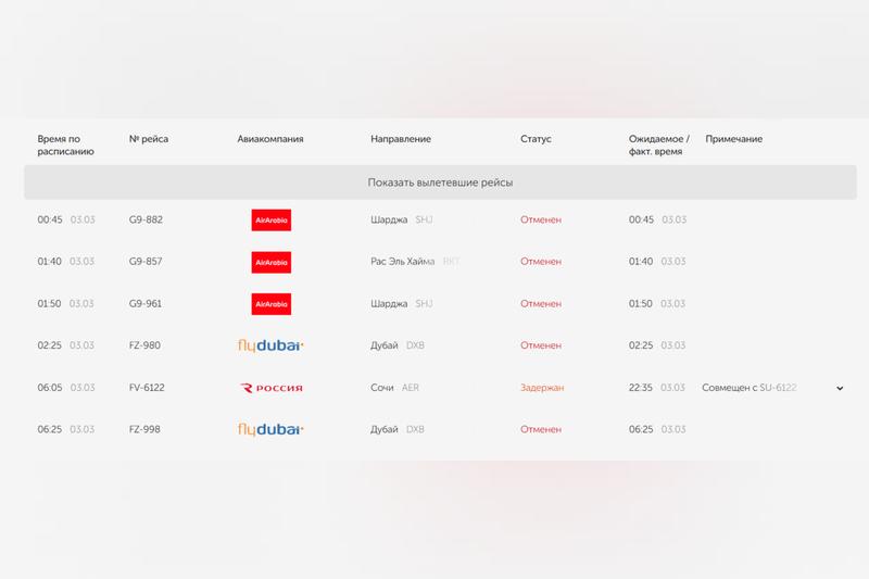 Примечательно, что в расписании есть рейсы российских авиакомпаний в ОАЭ. На момент публикации время вылета самолетов не корректировалось.