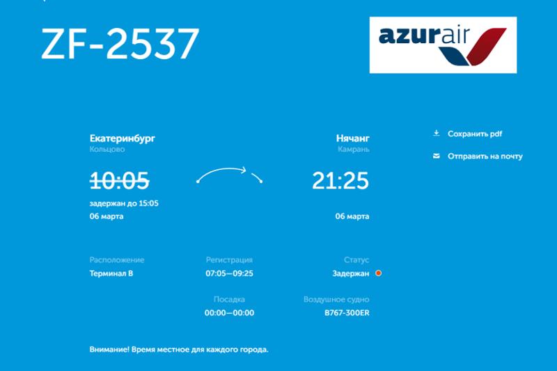 Лайнер Azur Air должен был вылететь из столицы Урала 6 марта в 10:05. Однако вылет перенесли до 15:05. Причины задержки неизвестны.