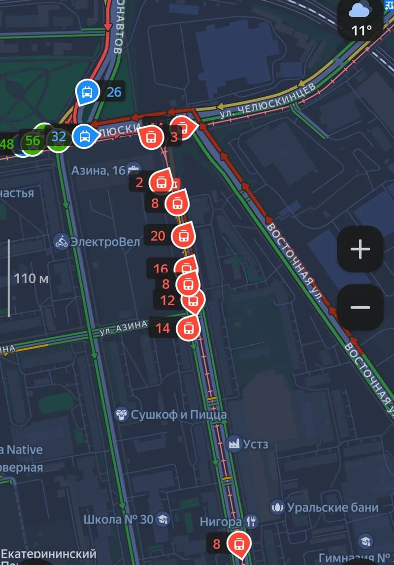 Транспорт остановился сегодня около 10:30. На «Яндекс Картах» видно скопление трамваев №№2,8, 20, 16, 12, 14. Тем, кто торопится, лучше выбрать другой вид транспорта.