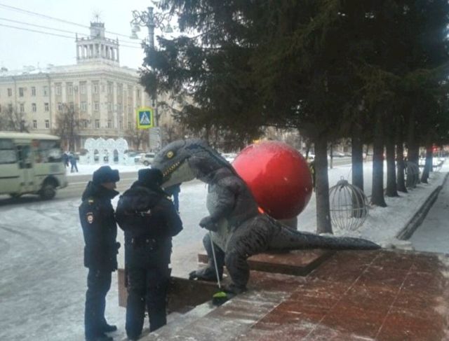 В Кургане к областному правительству вышел мужчина в костюме динозавра и стал подметать крыльцо. На место незамедлительно прибыл наряд ППС.