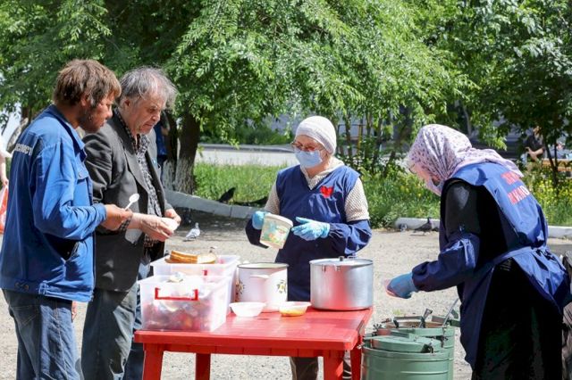 «Мы счастливы, что возвращаемся к этой деятельности. Надоело сидеть по домам, только в храме и спасались от одиночества. Всегда мы кормили за обед примерно по 50 человек, но сегодня людей мало – чуть более десятка. Из-за перерыва, связанного с коронавирусом, люди отвыкли от того, что ежедневно с 14:00 до 15:00 на площадке возле пригородного вокзала Кургана приходские экипажи милосердия бесплатно кормят всех нуждающихся», – поделились женщины.