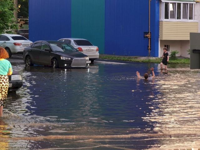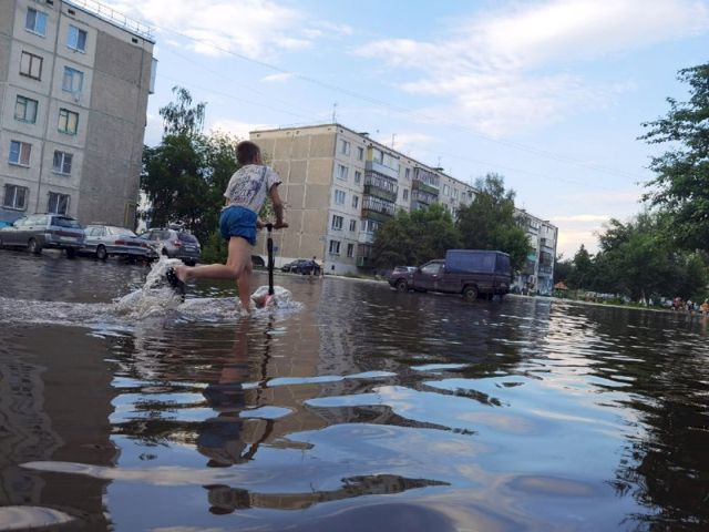 По соцсетям распространяются фотографии потопа во дворе домов № 4 и 8 на ул. Черняховского в Кургане. После ливня там образовалась гигантская лужа, в которой купались дети. Причина застоя воды – засорившаяся ливневая канализация.