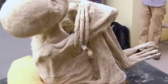 В Сети появился ролик, на котором запечатлено тело необычного существа, которое обнимает колени очень длинными руками, пишет Life. Местные жители считают, что мумия принадлежит инопланетянину.