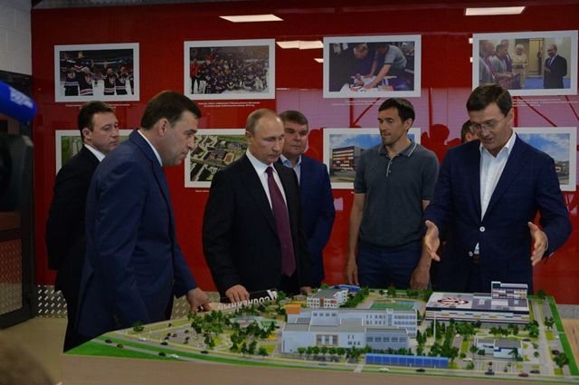 Владимир Путин в сопровождении главы Свердловской области Евгения Куйвашева посетил комплекс «Дацюк-арена», построенный в Екатеринбурге для юных хоккеистов на средства президентского гранта, областного и местного бюджетов. Глава государства также познакомился с проектом создания «Авто-арены» — еще одного ледового дворца.