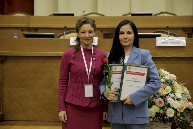 Анна Кузнецова наградила Фонд святой Екатерины за помощь в организации форума. Благодарственное письмо было вручено председателю попечительского совета фонда Татьяне Алтушкиной.