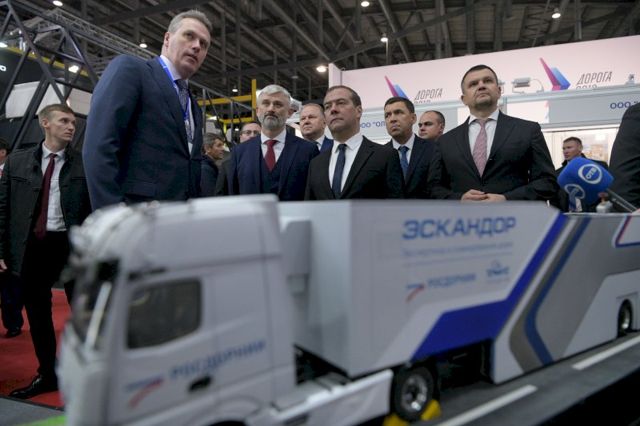 Кроме того, Дмитрий Медведев в сопровождении заместителя председателя правительства России Максима Акимова, министра транспорта России Евгения Дитриха, полпреда президента Николая Цуканова и губернатора Евгения Куйвашева осмотрел уличную экспозицию выставки, стенды других регионов страны и предприятий сферы автодора.