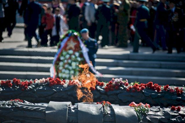 Для начала церемония возложения цветов и венков к Вечному огню на бульваре Славы. К ней, отчасти в силу небольшого пространства вокруг Вечного огня, очень камерной и потому трогательной, вопросов никаких. Как и к шествию Бессмертного полка.
