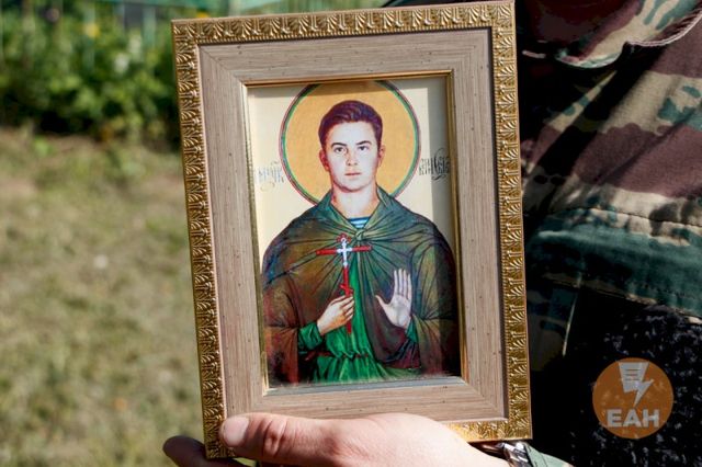 Паломник с военной выправкой Александр раздает на могиле Родионова его фото и иконки с ним. Очень помогает в делах, особенно армейских, уверяет Александр. Он отставной контрактник, ветеран обеих «чеченских» и верит в силу святого воина Евгения давно.