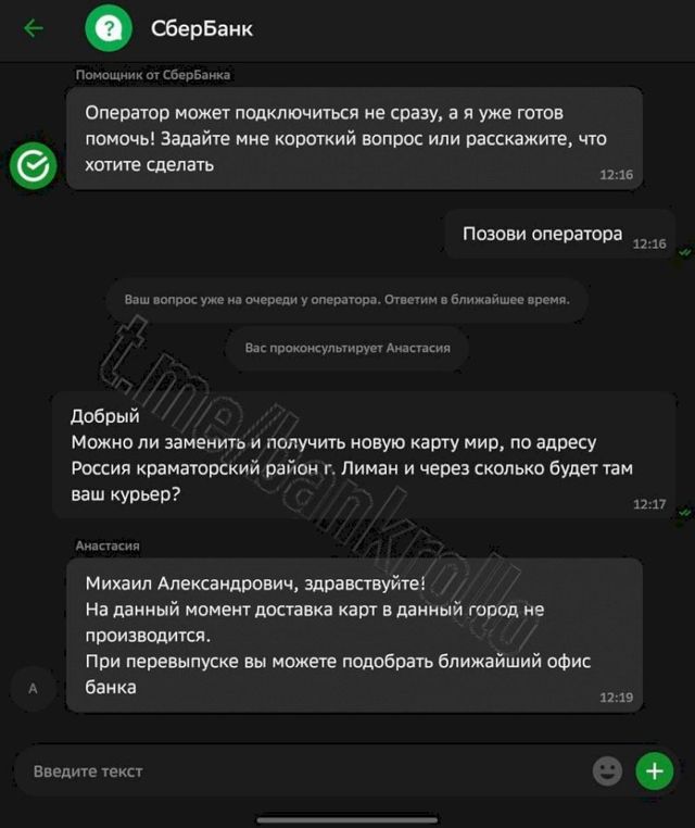 «Пользователи троллят крупные банки, заказывая доставку пластиковых карт в области, недавно вошедшие в состав России. А те им отказывают», – пишет канал. И действительно, пользователи просят крупнейшие банки (на скриншотах видно, что общение идет с представителями "Тинькоф" и Сбера) доставить им карты по адресу Россия, Мариуполь и Россия, Краматорский район, Лиман.