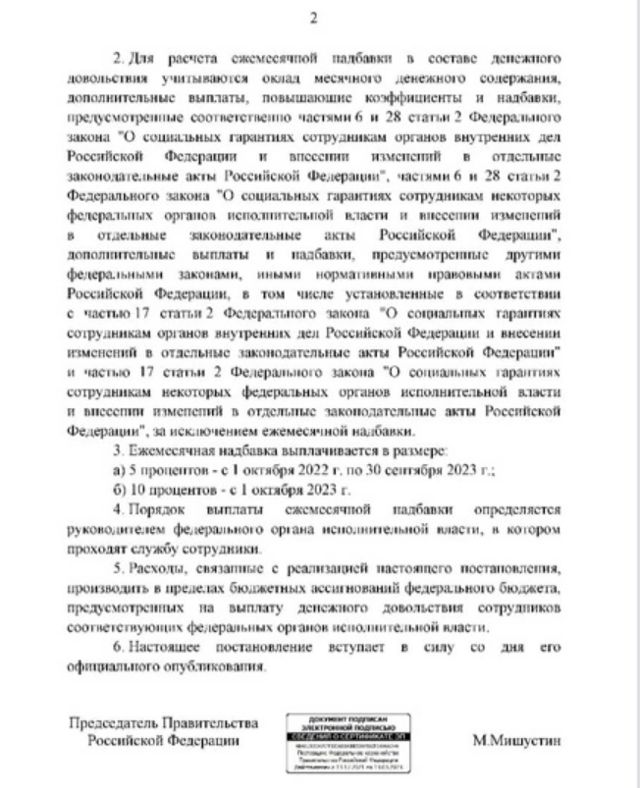 В постановлении сказано, что в целях увеличения материального обеспечения сотрудников органов внутренних дел Российской Федерации и органов уголовно-исправительной системы, органов принудительного исполнения, федеральной Государственной противопожарной службы, таможенных органов, лиц, проходящих службу в войсках Национальной гвардии, лиц начальствующего состава федеральной фельдъегерской связи и стимулирования ими выполнения служебных обязанностей правительство РФ постановляет установить ежемесячные надбавки.