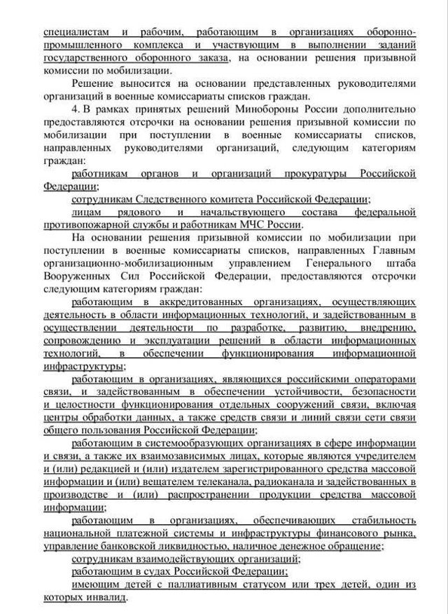 На основании решения призывной комиссии по мобилизации при поступлении в военные комиссариаты списков, направленных Главным организационно-мобилизационным управлением Генерального штаба Вооруженных Сил РФ, предоставляются отсрочки следующим категориям граждан: