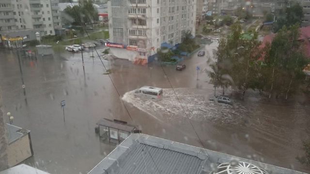 В Тобольске из-за дождей затопило улицы. Транспорт ездит по городу, рассекая по волнам, пишет паблик «Типичный Тобольск».