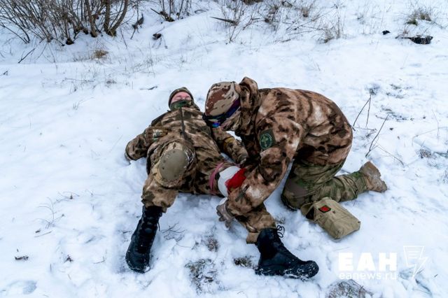 Шум проводит занятия по медподготовке на учениях народного ополчения