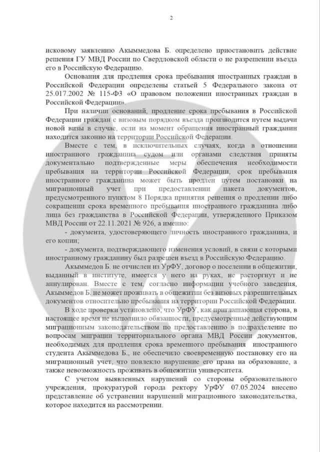 «В ходе проверки установлено, что УрФУ, как приглашающая сторона, не выполнил обязанности, предусмотренные действующим миграционным законодательством, по предоставлению в подразделение по вопросам миграции территориального органа МВД России документов, необходимых для продления срока временного пребывания иностранного студента Акыммедова Б., не обеспечил своевременную постановку его на миграционный учет, что повлекло нарушение его права на образование, а также невозможность проживать в общежитии университета. С учетом выявленных нарушений со стороны образовательного учреждения прокуратурой города ректору УрФУ 07.05.2024 внесено представление об устранении нарушений миграционного законодательства», - заявила прокурор Екатеринбурга Светлана Кузнецова.