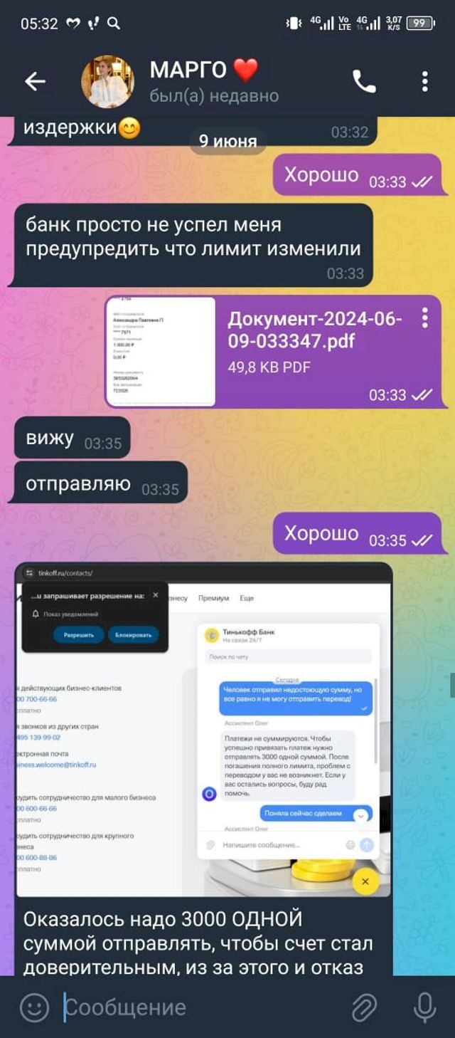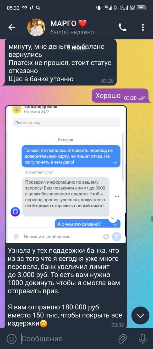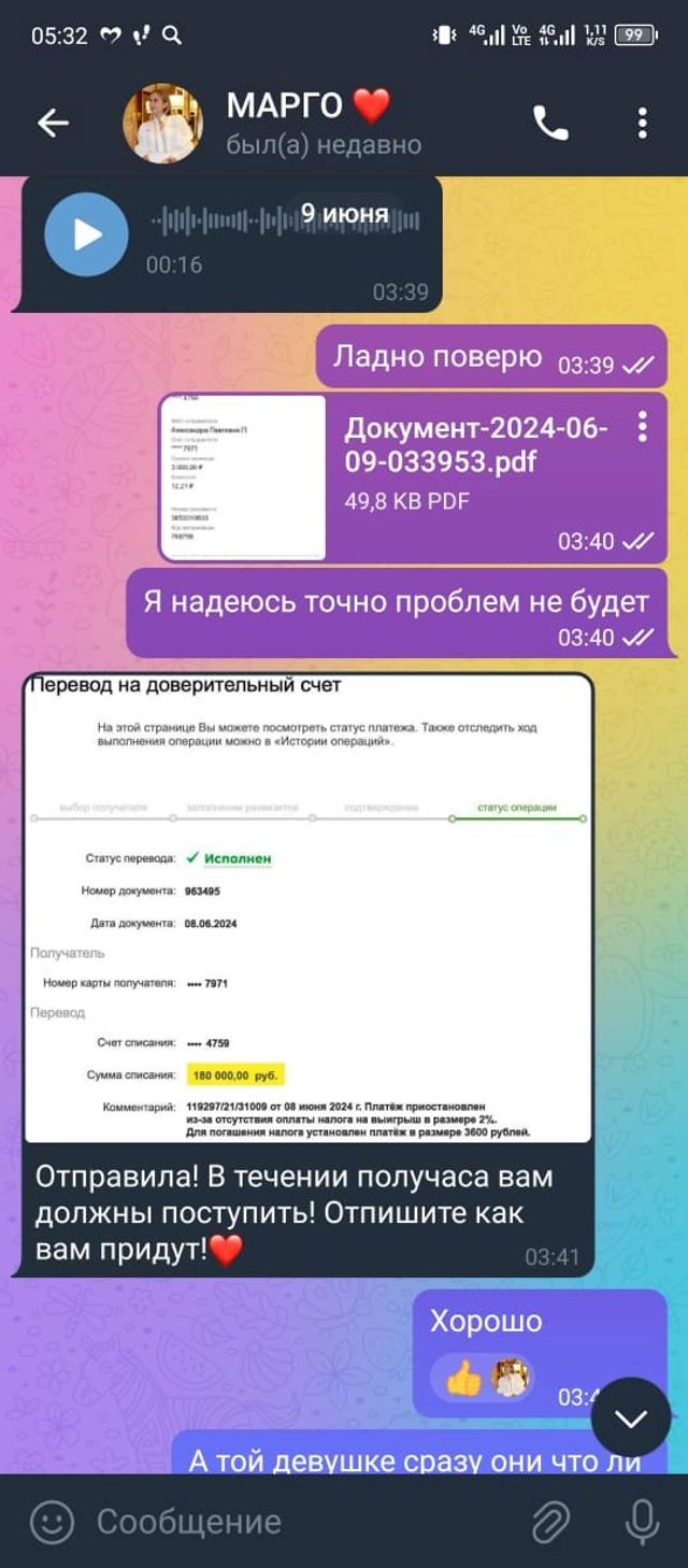 «Мне пришло сообщение с telegram-канала «Марго», что у них был розыгрыш, случайно выпал мой телефонный номер и я выиграла 150 тыс. рублей. Со мной связалась менеджер канала и сообщила, что надо заплатить налог 3600 рублей. Я несколько раз отправляла деньги, но всякий раз что-то мешало им дойти до адресата. В общей сложности я отправила 13200 рублей. Мне даже пообещали, что в качестве компенсации мне заплатят 180 тыс., а не 150», - рассказала ЕАН Александра.