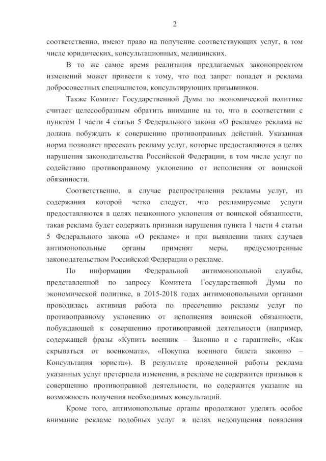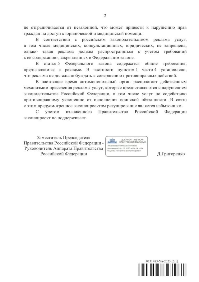 «В настоящее время антимонопольный орган располагает действенным механизмом пресечения рекламы услуг, которые предоставляются с нарушением законодательства Российской Федерации, в том числе услуг по содействию противоправному уклонению от исполнения воинской обязанности. В связи с этим предусмотренное законопроектом регулирование является избыточным», - сказано в документе за подписью заместителя председателя правительства РФ Дмитрия Григоренко.